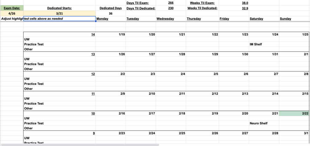 This is the scheduler I used to keep track of my Step 2 studying during my 3rd year of medical school. Input 0 for price to get this for free!